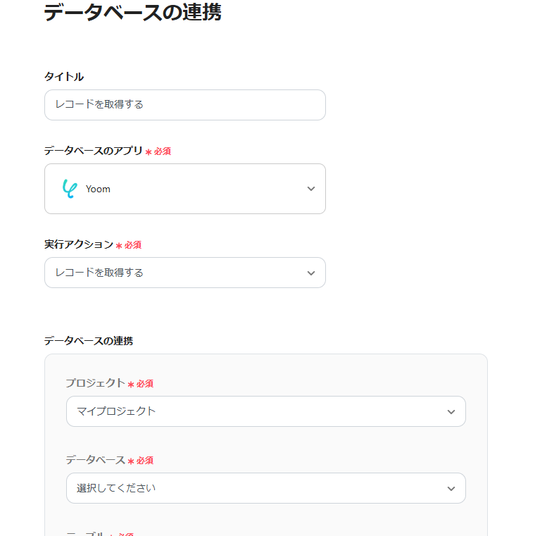なお、このブログではYoomのデータベースで以下のようなデータベースを作成し、使用しています。