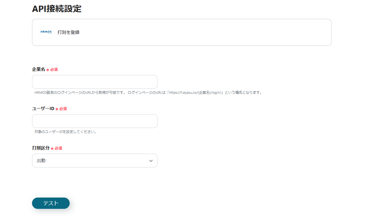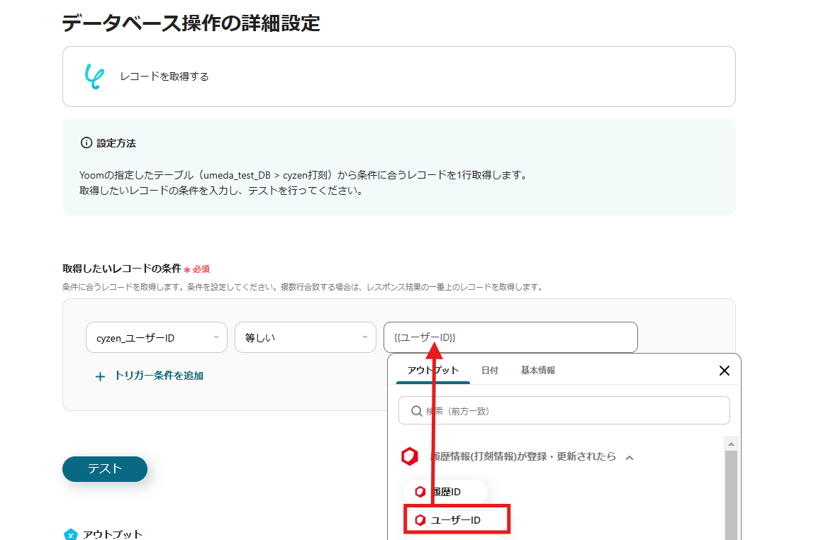 ユーザーIDは{{HRMOS勤怠_ユーザーID}}をアウトプット情報から選択します。