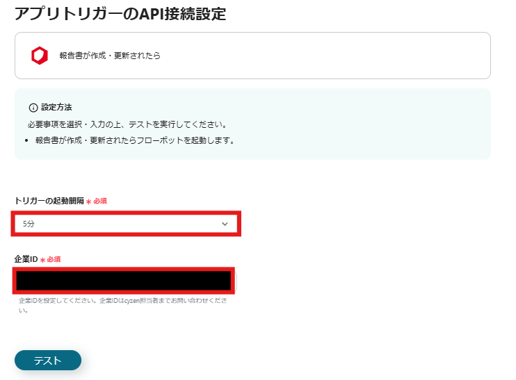 アプリトリガーのAPI接続設定の画面が表示されます。