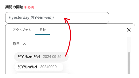 →テストをクリック →成功 アウトプットには、昨日のデータが正しく抽出されました。