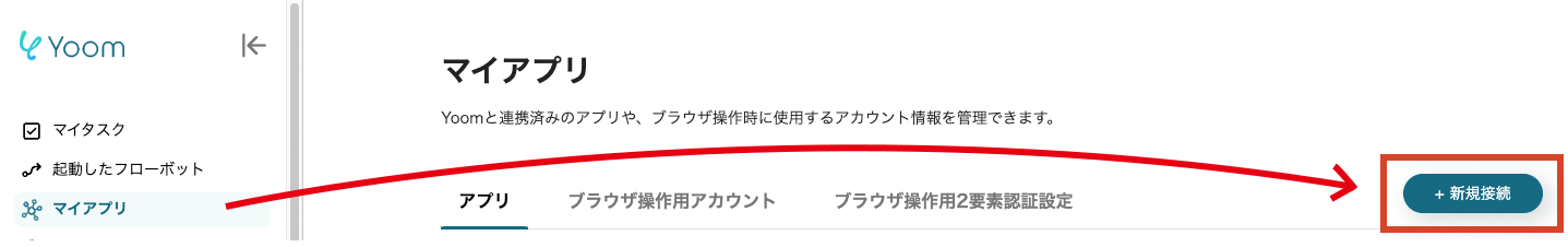 ここでは、連携するアプリをYoomに登録する設定を行います。Yoomのワークスペースにログインいただき、マイアプリの項目から新規接続をクリック!