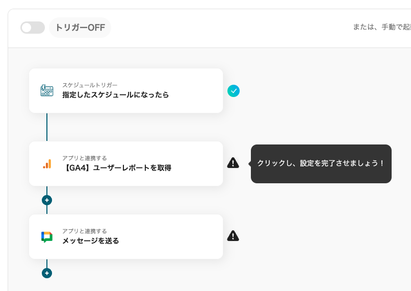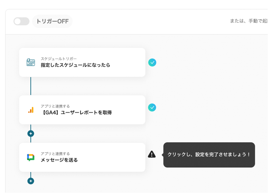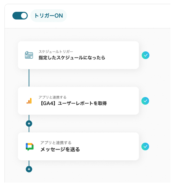 そこで、Yoomでは「毎日Google アナリティクスから最新のレポートを取得し、Google Chatに通知する」フローボットを開発しました。この自動化で、これらの負担を軽減し正確なデータを効率よくチームに届けられるようになります。