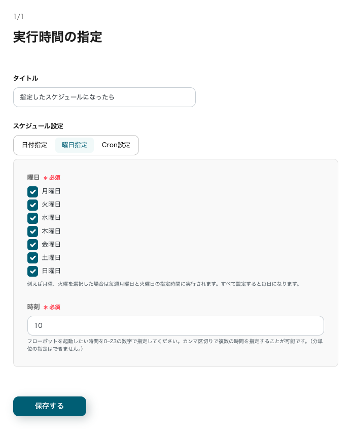 今回は、毎日朝10時に起動する設定にしています。任意のタイミングに変更が可能です。Cron設定を使用すれば、より細かい時間の設定もできます。