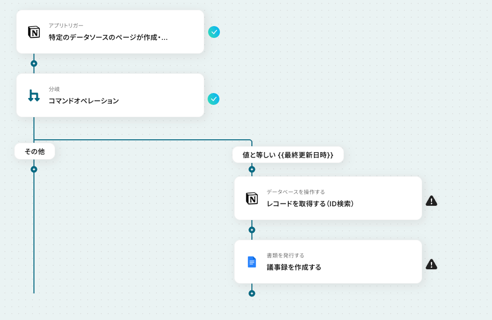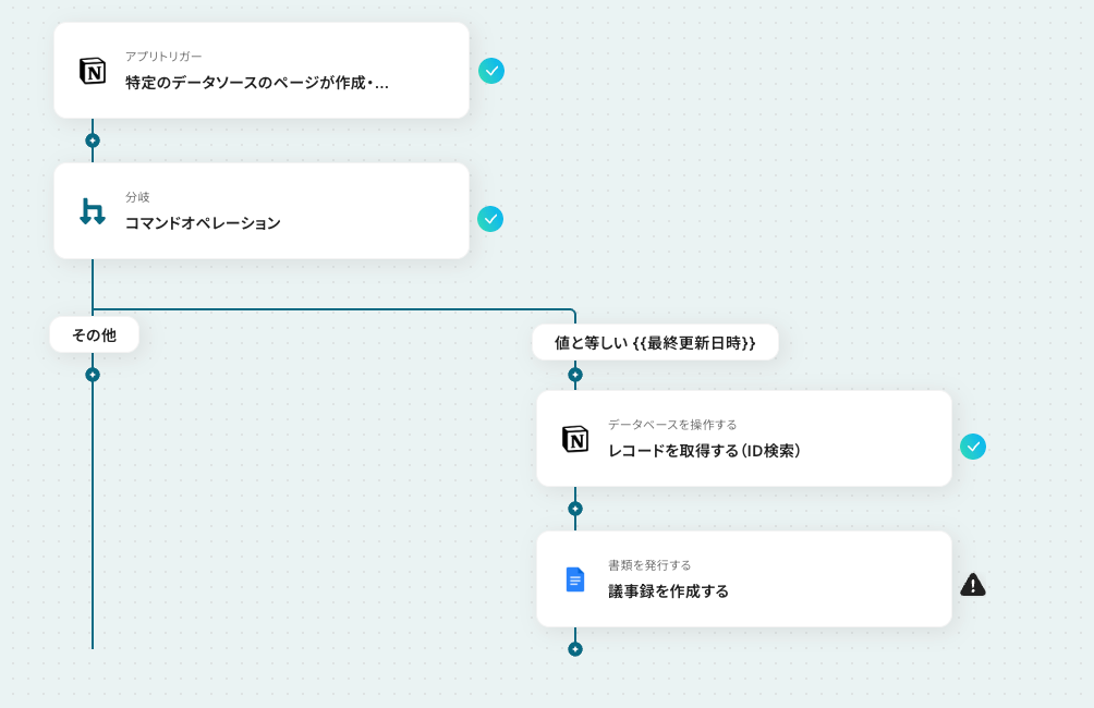 はじめに、NotionとGoogleドキュメントをYoomと連携します。 トリガーでNotionの「特定のデータソースのページが作成・更新されたら」アクションを設定し、対象のデータベースを指定します。 次に、分岐機能を選択し、特定の条件を満たした場合にのみ後続の処理に進むよう設定します。 続いて、オペレーションでNotionの「レコードを取得する」アクションを設定し、トリガーとなったページの詳細情報を取得します。 最後に、Googleドキュメントの「書類を発行する」アクションを設定し、取得した情報を基に議事録を作成します。 ※「トリガー」:フロー起動のきっかけとなるアクション、「オペレーション」:トリガー起動後、フロー内で処理を行うアクション