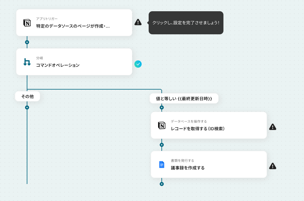 Notionの情報を基に議事録を自動作成するフローを作ってみよう それではここから代表的な例として、Notionで会議内容が記録された際に、その情報を基にGoogle ドキュメントで議事録を自動で作成するフローを解説していきます!