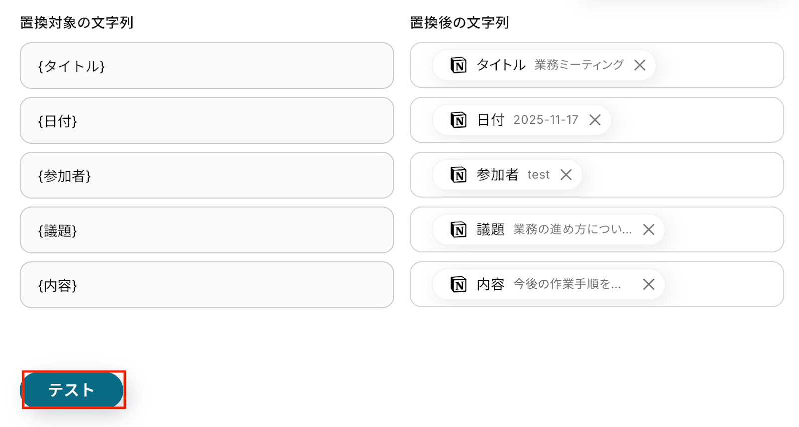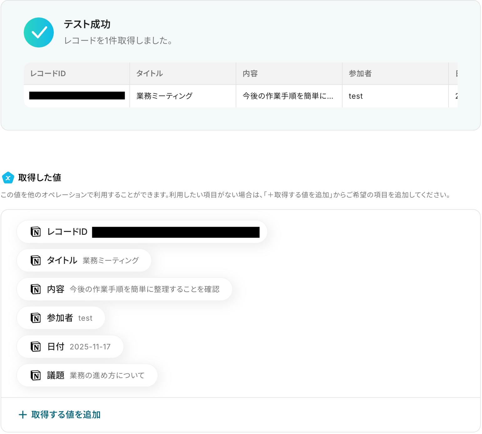 テストに成功すると、Notionで新たに作成されたページ(レコード)に関する情報が一覧で表示されます。