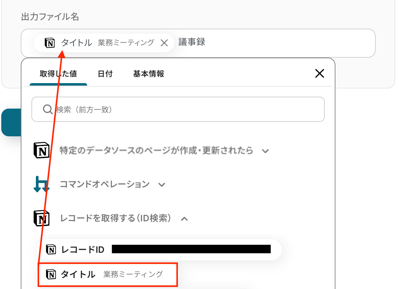 オペレーションにNotionのアクション「レコードを取得する(ID検索)」を選択し、取得した値の中から「タグ」など条件に利用する項目を指定します。