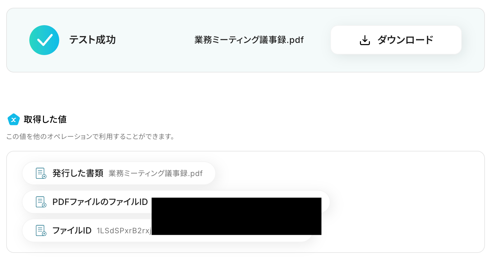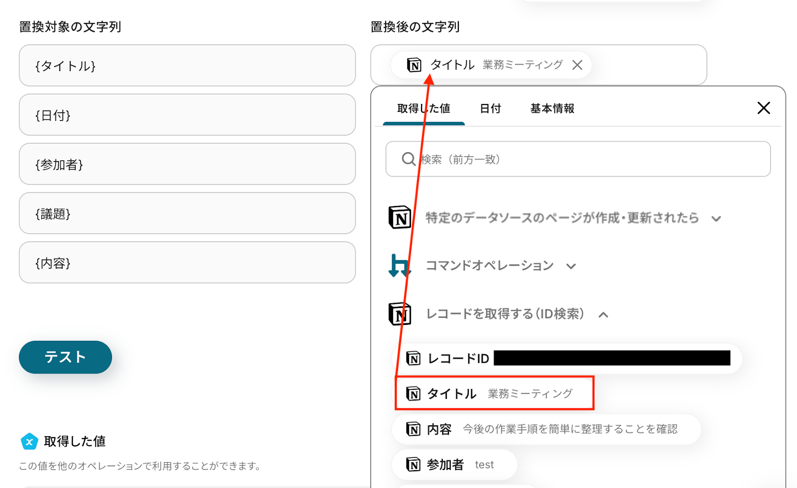 ※取得した値 とは? トリガーやオペレーション設定時に、「テスト」を実行して取得した値のことを指します。 後続のオペレーション設定時の値として利用でき、フローボットを起動するたびに変動した値となります。