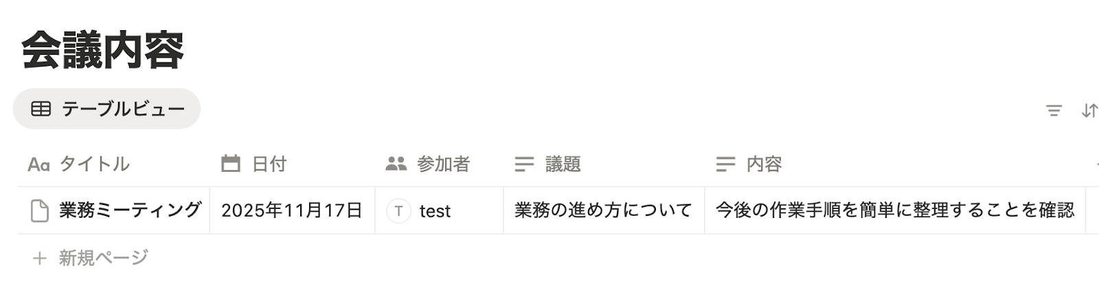 Notion上に会議内容のページ(レコード)を作成しておきましょう。