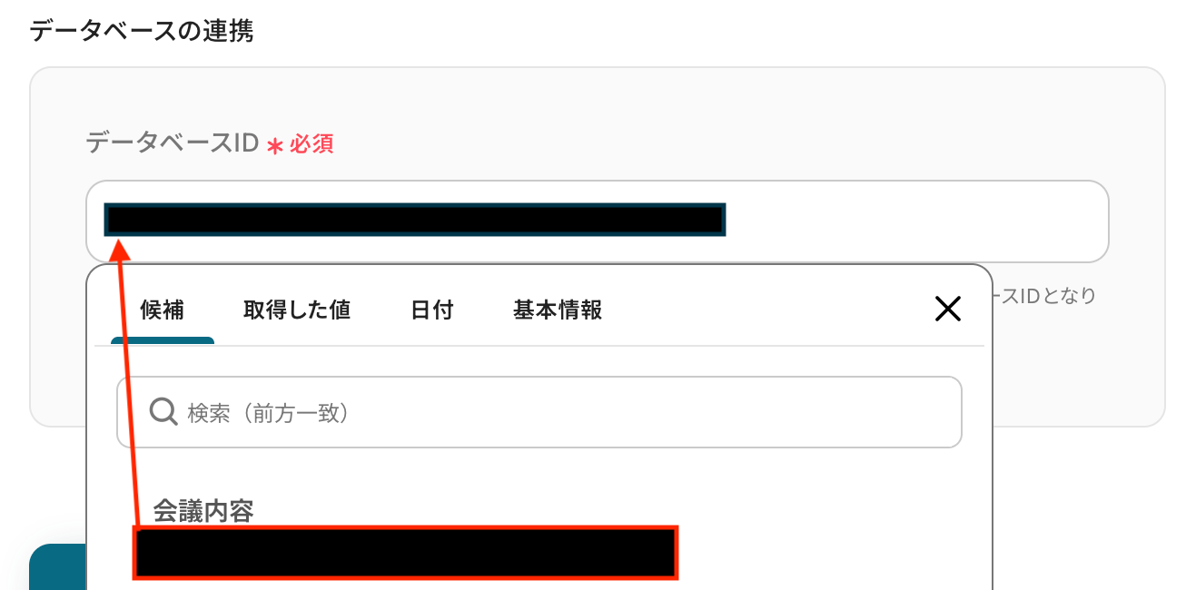 最終更新日時はデフォルトで設定されていますが、誤って消してしまった場合などは、画像のとおり入力欄をクリックすると前のステップでNotionから取得した値が表示されます。 その中から「最終更新日時」を選択してください。