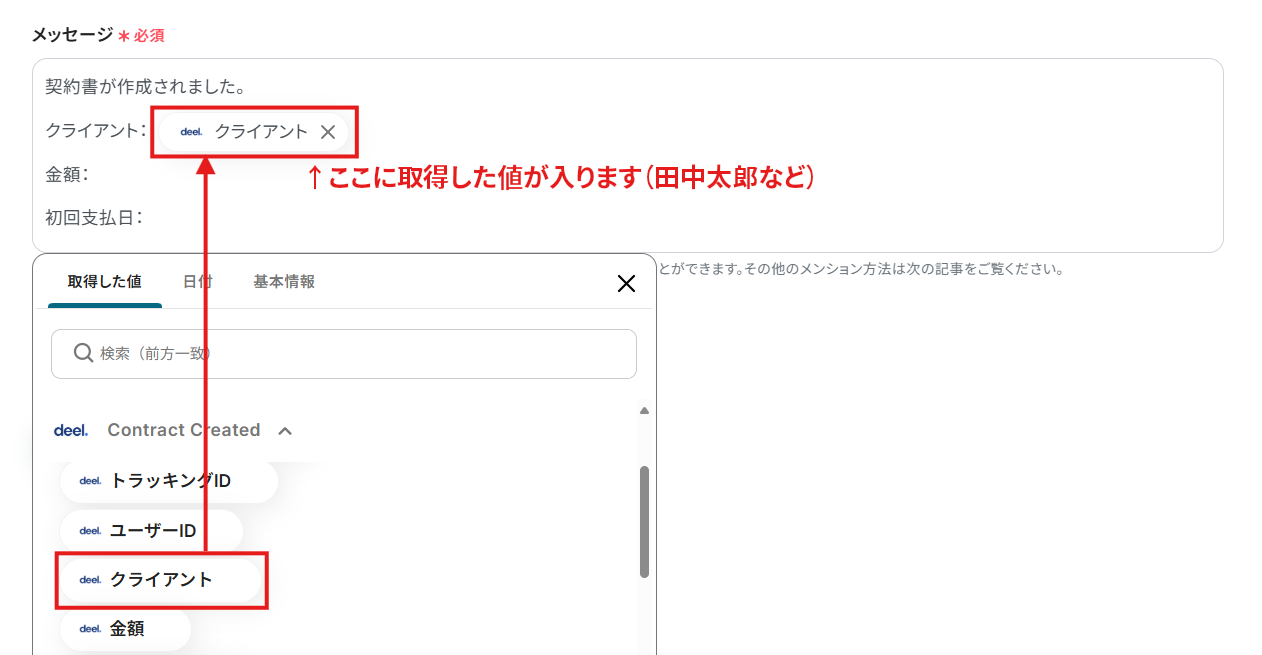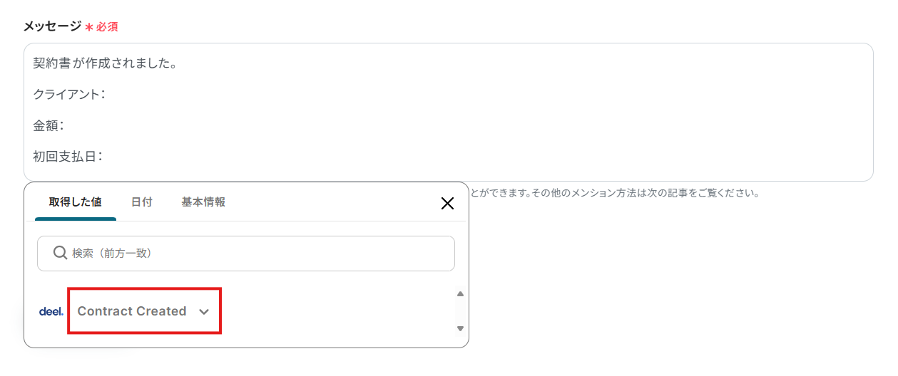 これらの値を用いて、作成した契約書を通知するメッセージを設定しましょう。