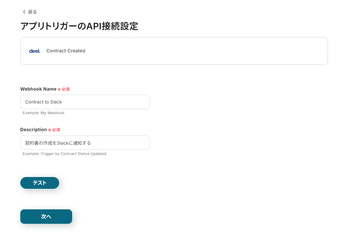 - 先ずは、契約書の作成を検知するWebhookを登録します。Webhookの用途が分かりやすい名称にするとよいでしょう。
