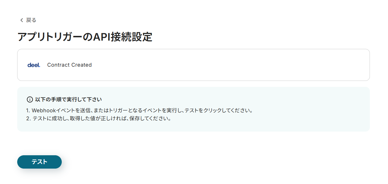 - 次は登録したWebhookが正常に契約書を検知できるかのテストを行います。
