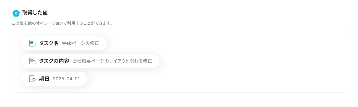 これらの値は、以降のアクションで変数(フローが稼働する度に更新される値)として使用できるようになります。