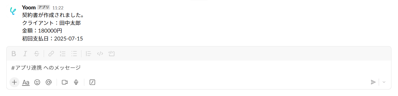 トリガーをONにしたら、実際に動作することを確認しましょう。Deelで契約書を作成し、その内容がSlackに指定した通りに通知されていれば成功です。