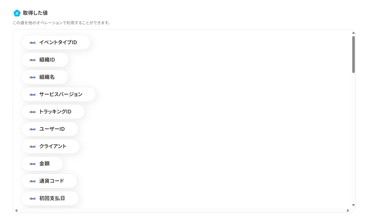 - テストに成功すると、作成した契約書の情報が「取得した値」に追加されます。