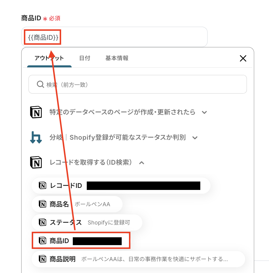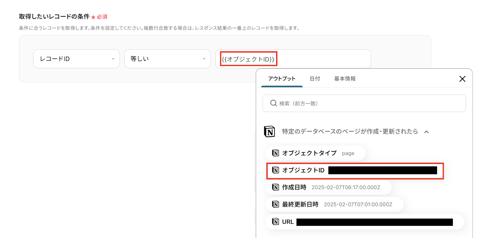 レコード取得アクションで取得したアウトプットを引用して設定します。