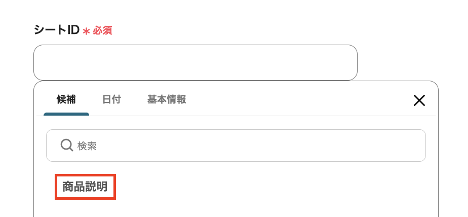 「シートID」欄をクリックすると、先ほどと同様に候補が表示されるので、使用するスプレッドシートのタブを候補から選択するか、手入力してください。