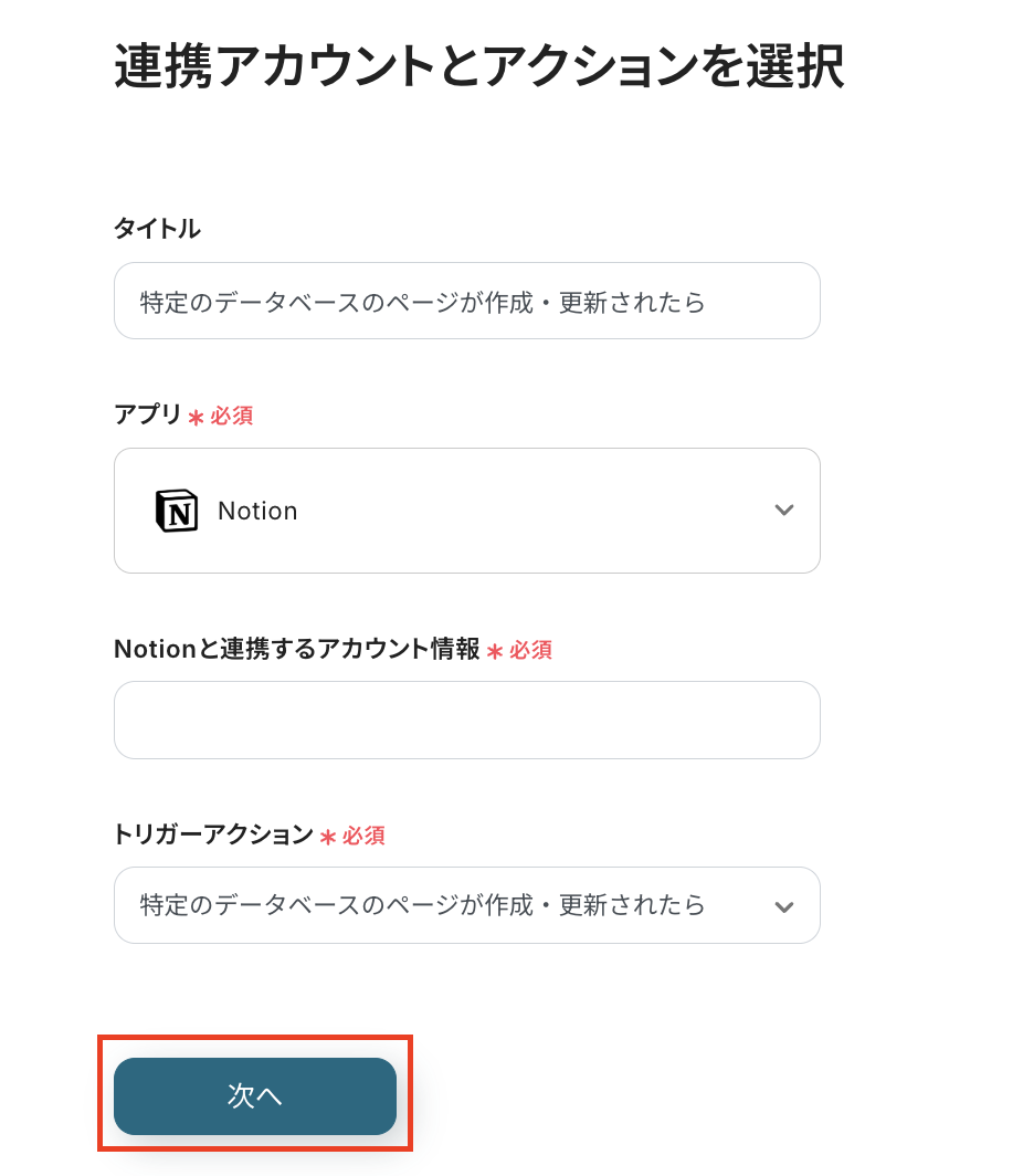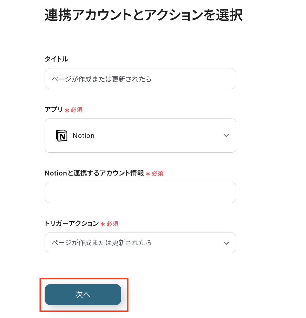 連携アカウントとアクション選択画面が表示されるので、タイトルを任意で変更し、連携したいアカウントを選択して「次へ」をクリックします。