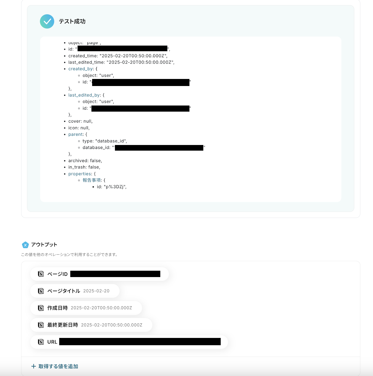 設定完了後、「テスト」を実行し、アウトプットが取得されていることを確認してください。