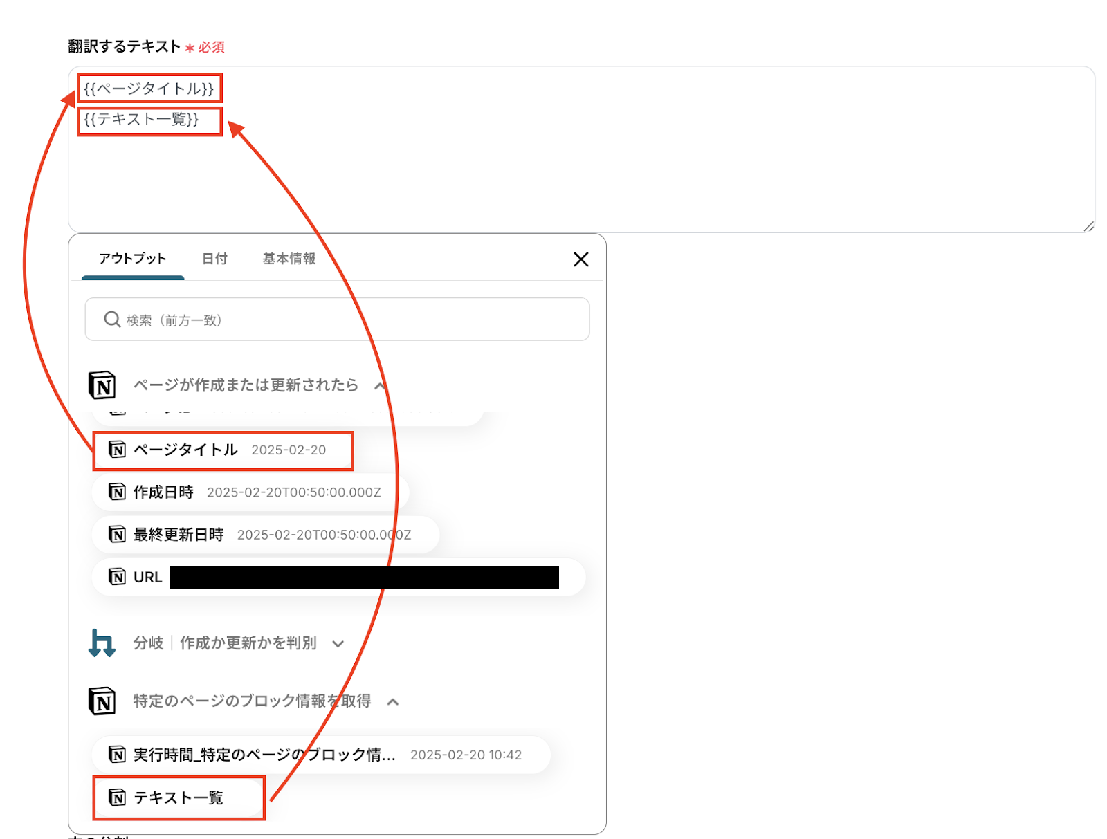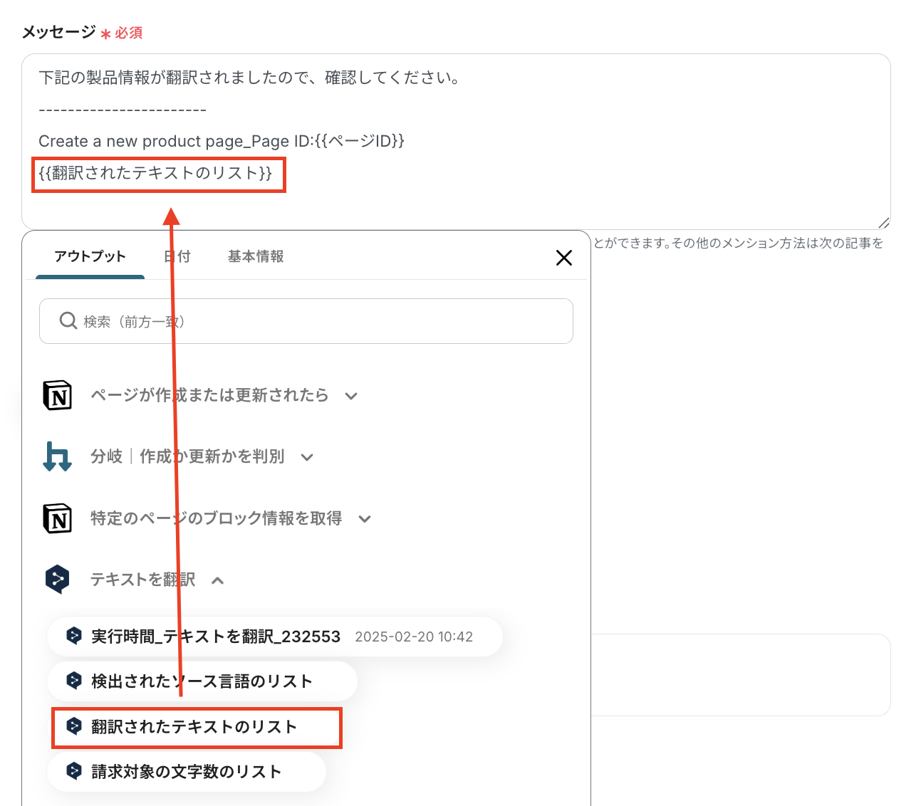 DeepLのテキスト翻訳アクションで取得したアウトプットを引用して設定します。