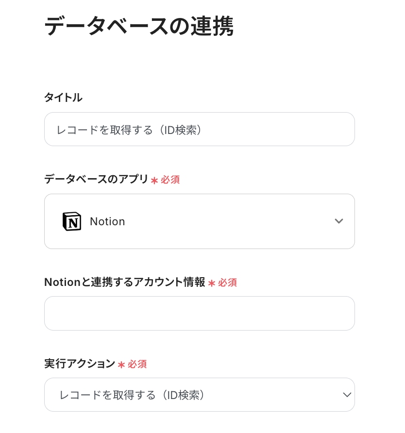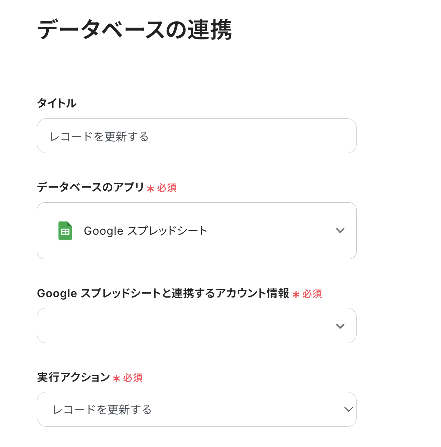 データベース連携画面が表示されるので、タイトルを任意で変更し、「連携アカウント」を、アプリトリガーで連携したアカウントと同じものを選択しましょう。