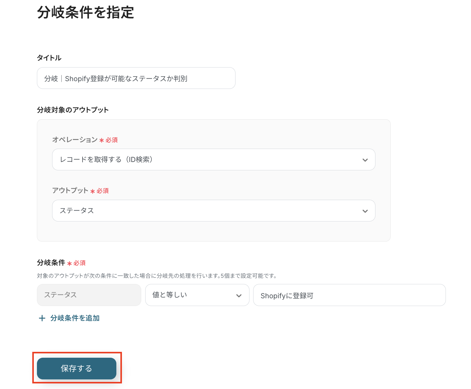「分岐|Shopify登録が可能なステータスか判別」をクリックします。