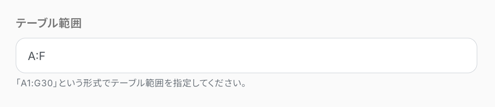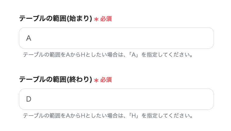 取得したい情報はA列〜D列なので、「テーブルの範囲(始まり)」「テーブルの範囲(終わり)」を下図のように指定します。