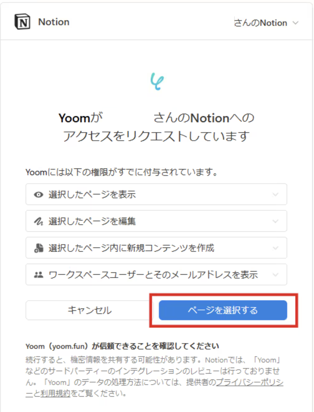 連携したいアカウントのログイン情報を入力し、「ページを選択する」をクリックしてください。
