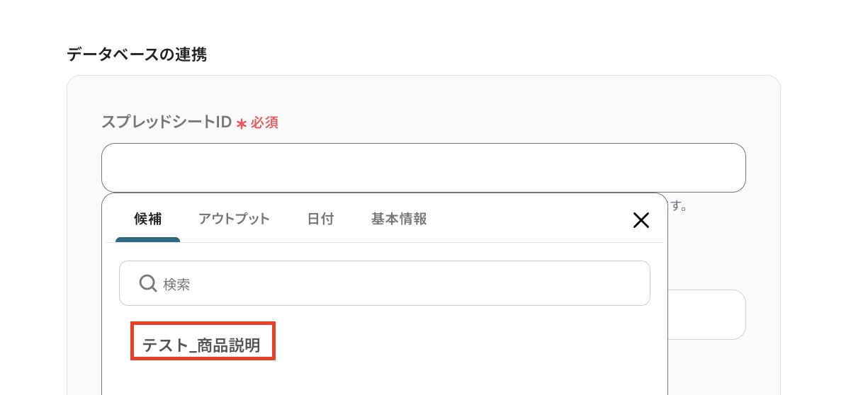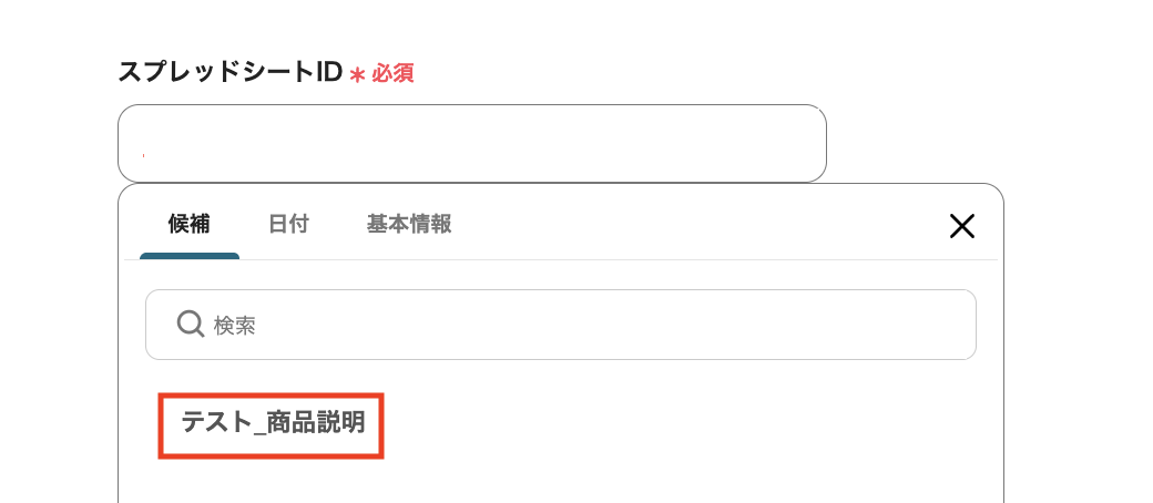 「スプレッドシートID」欄をクリックすると連携したアカウントから候補が表示されるので、商品情報を管理しているスプレッドシートを候補から選択するか、手入力してください。