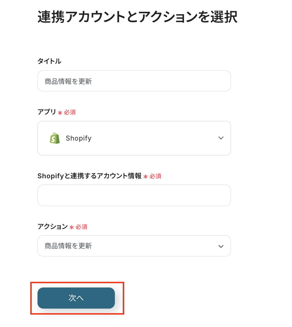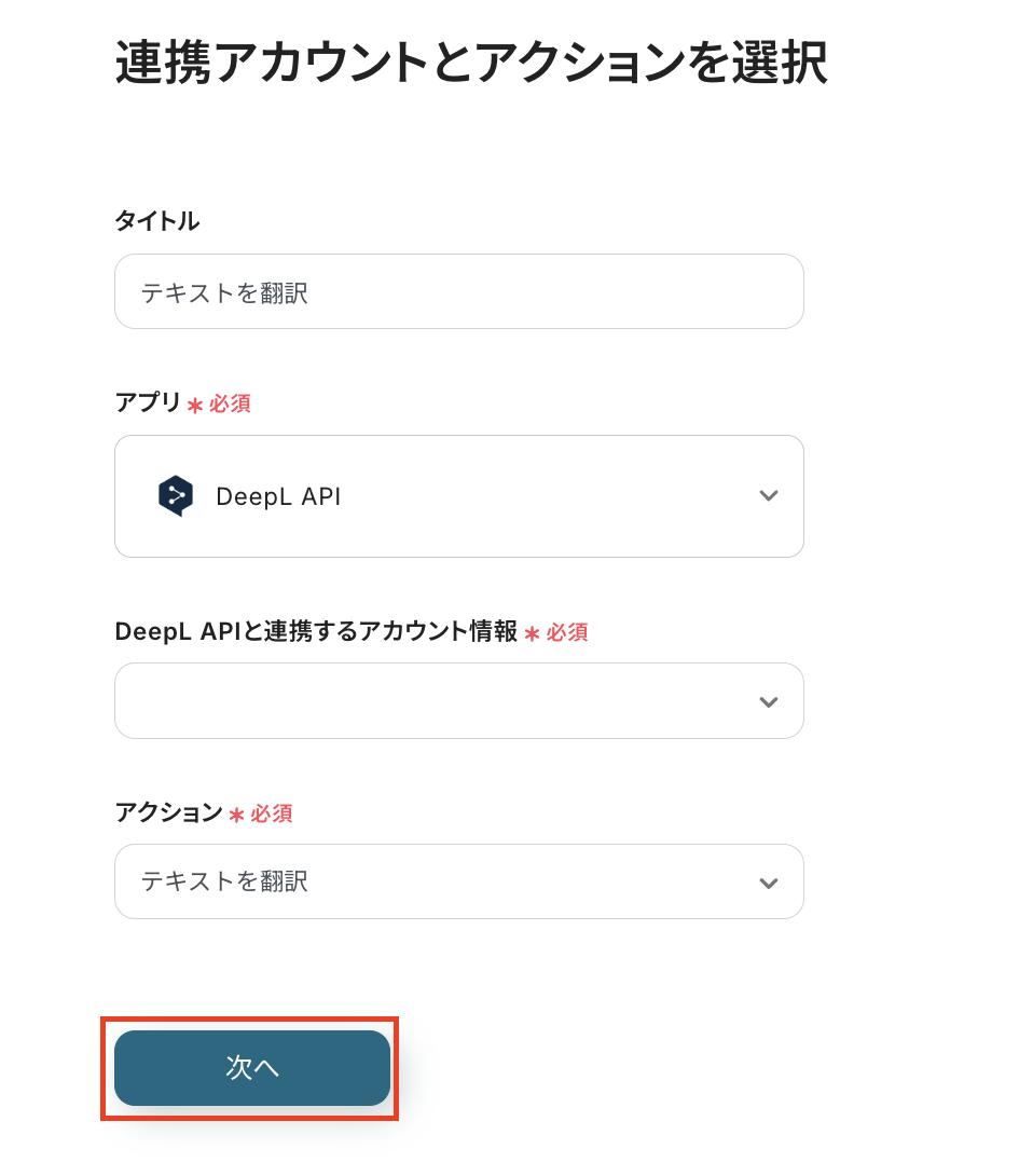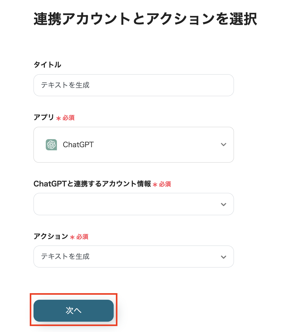 連携アカウントとアクション選択画面が表示されるので、タイトルを任意で変更し、連携するアカウントを選択して「次へ」をクリックします。