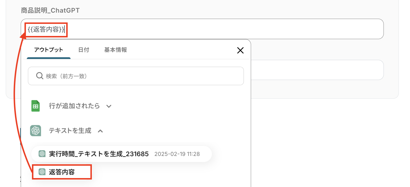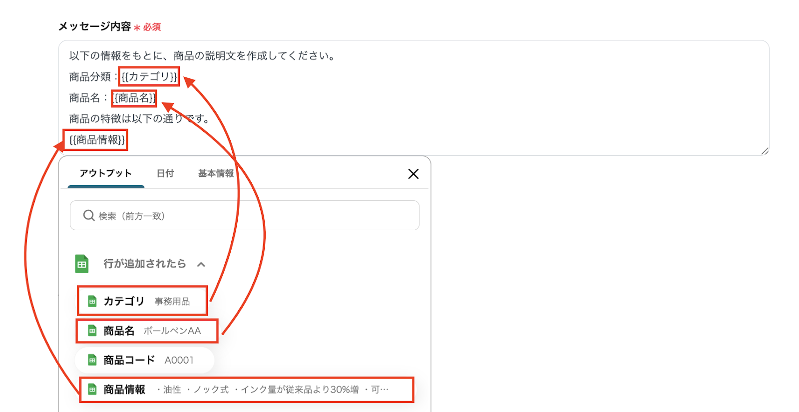どの商品でも共通して使用できるテキストを定型文として入力し、商品ごとに異なる情報はアウトプットを引用して設定します。