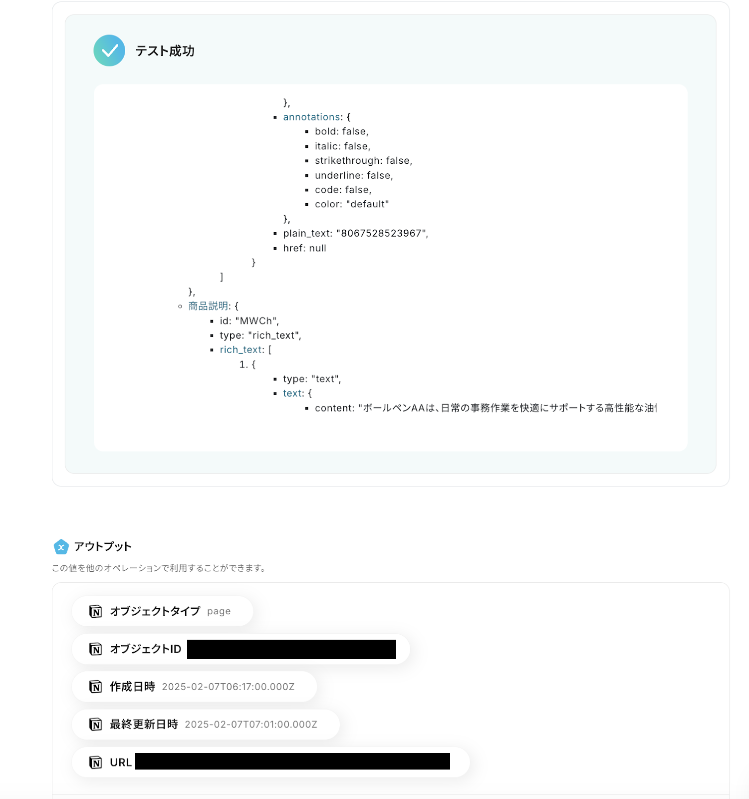 設定完了後、「テスト」を実行し、アウトプットを取得します。