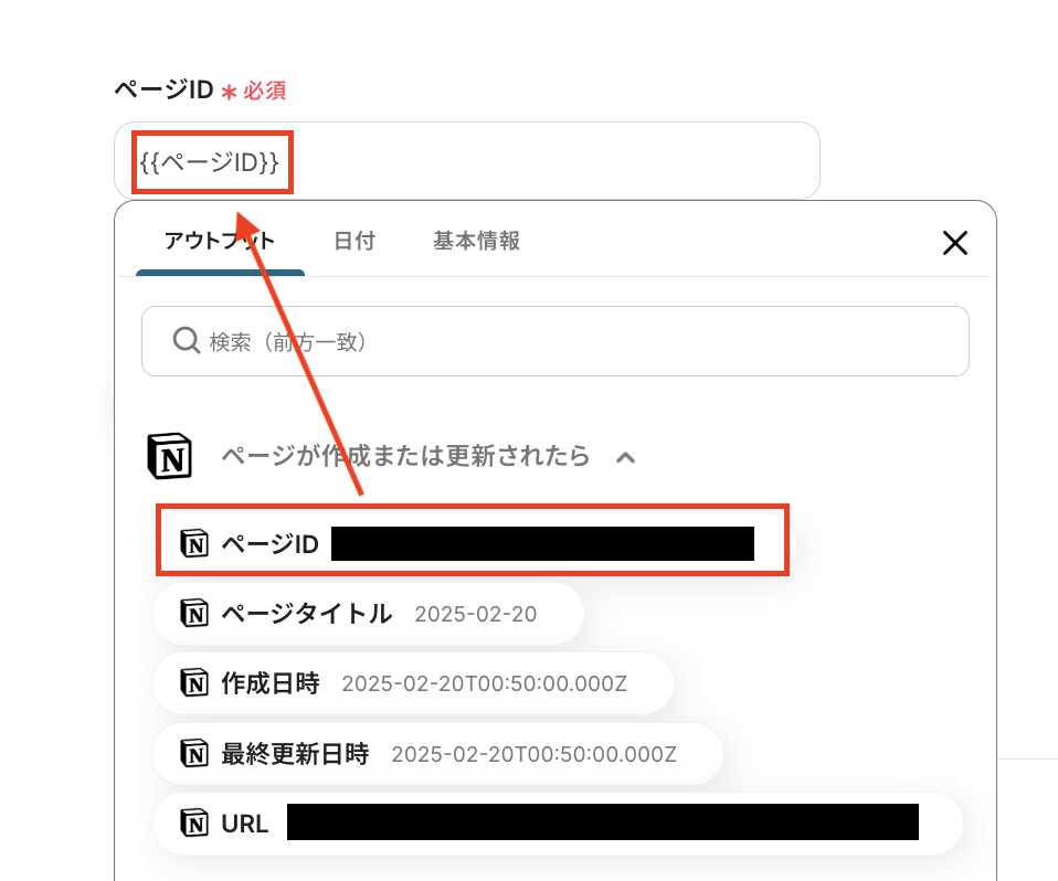 連携アカウントとアクション選択設定を行い、アプリトリガー設定で取得したアウトプットを引用して「ページID」を設定しましょう。