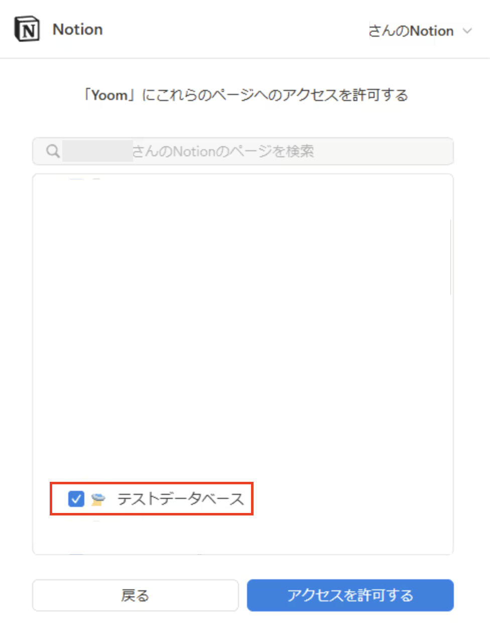 Notionで作成されているページの一覧が表示されるので、フローで使用するデータベースにチェックを入れ、「アクセスを許可する」をクリックしましょう。