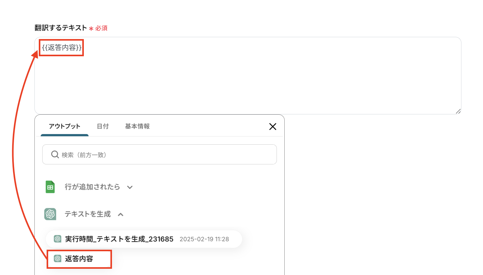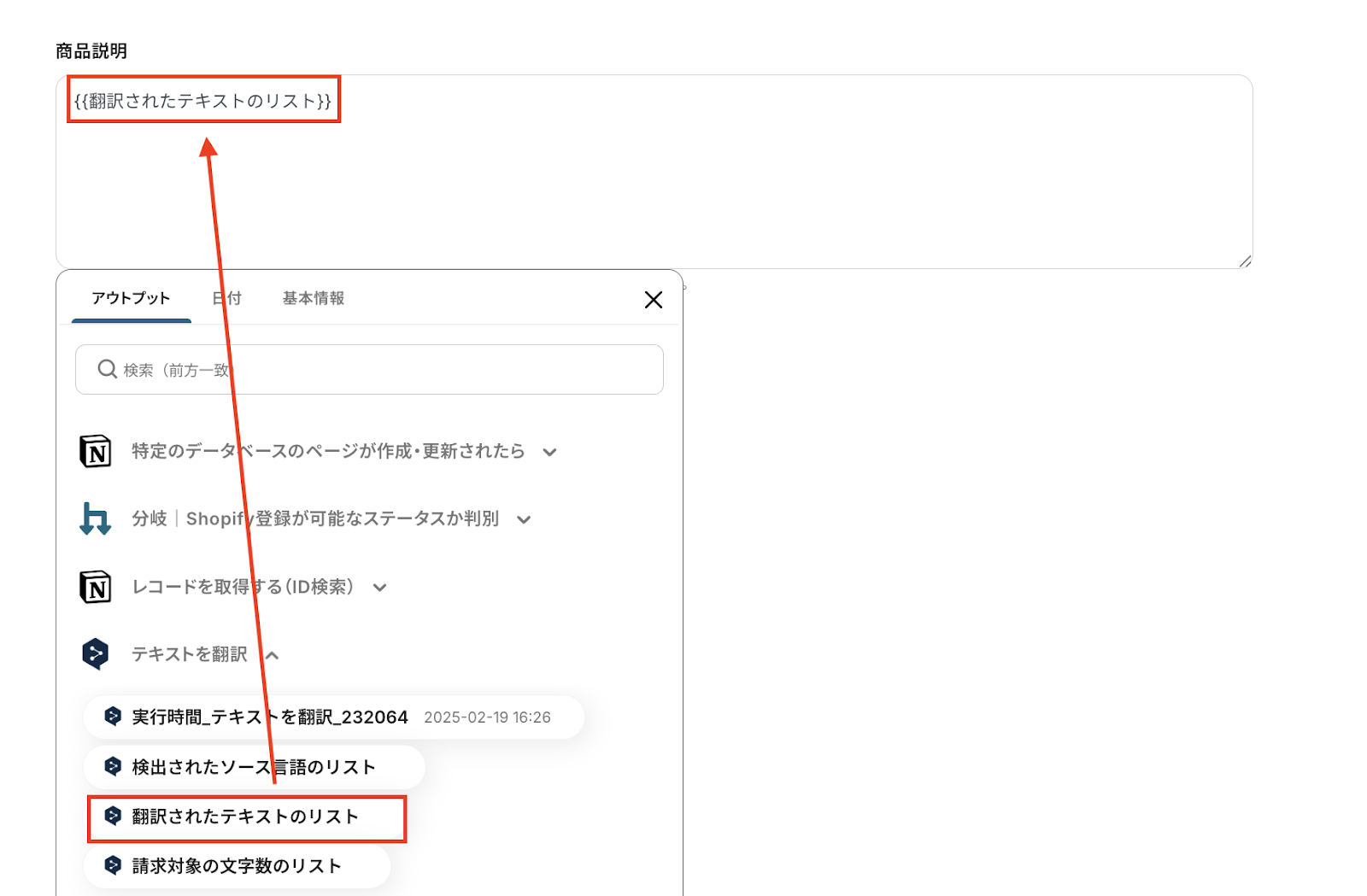 ChatGPTで自動作成した商品説明文を翻訳するので、先ほどChatGPTのアクション設定で取得したアウトプットを引用して設定します。