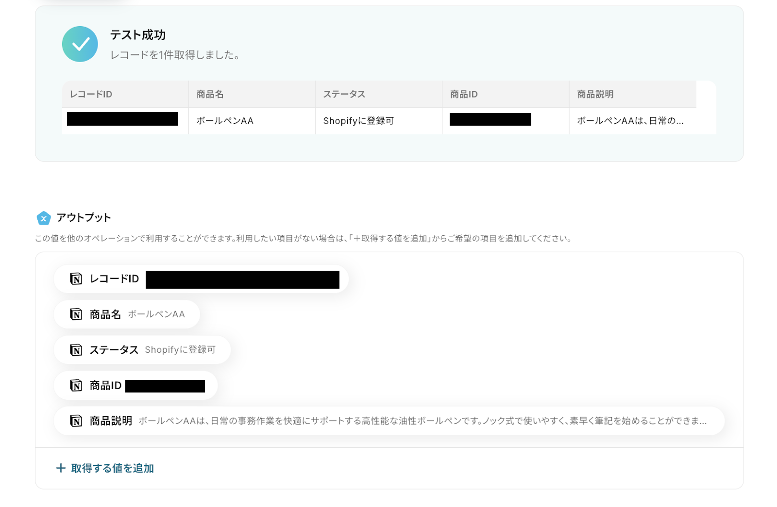 続いて、Notionから商品情報を取得するアクション設定を行います。