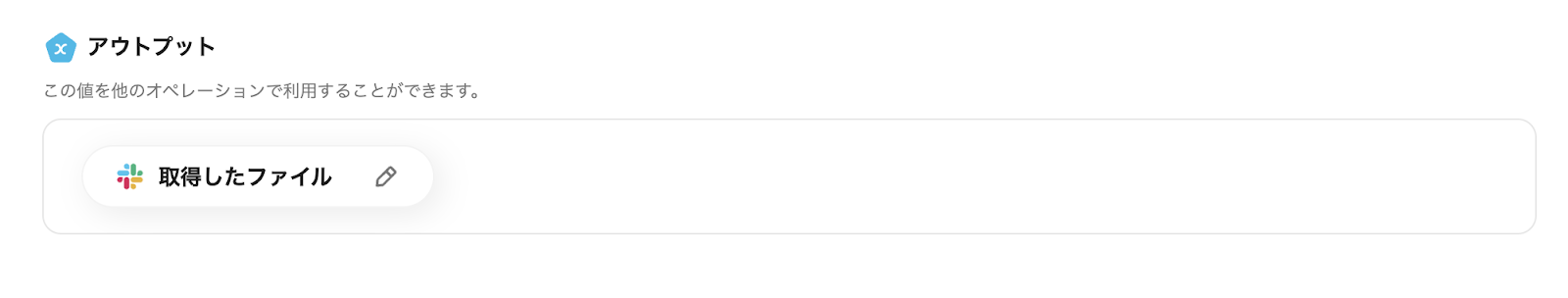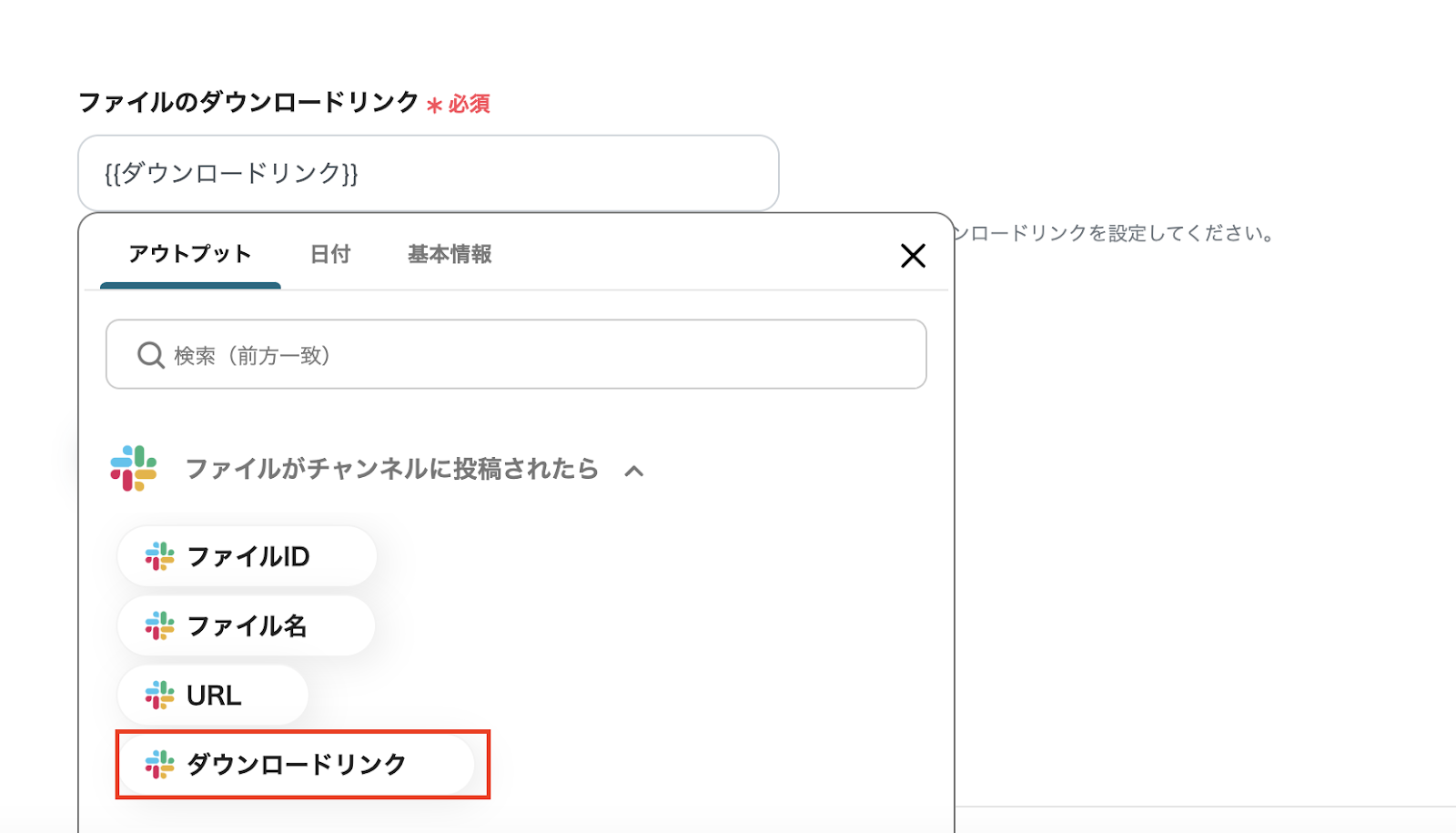 ファイルのダウンロードリンクは「ファイルがチャンネルに投稿されたら」のアウトプットから「ダウンロードリンク」を選択しましょう。