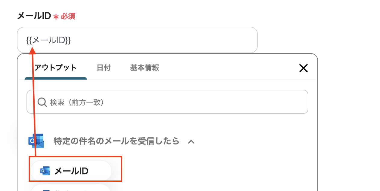 API接続設定のメールIDは、アウトプットを選択しましょう。