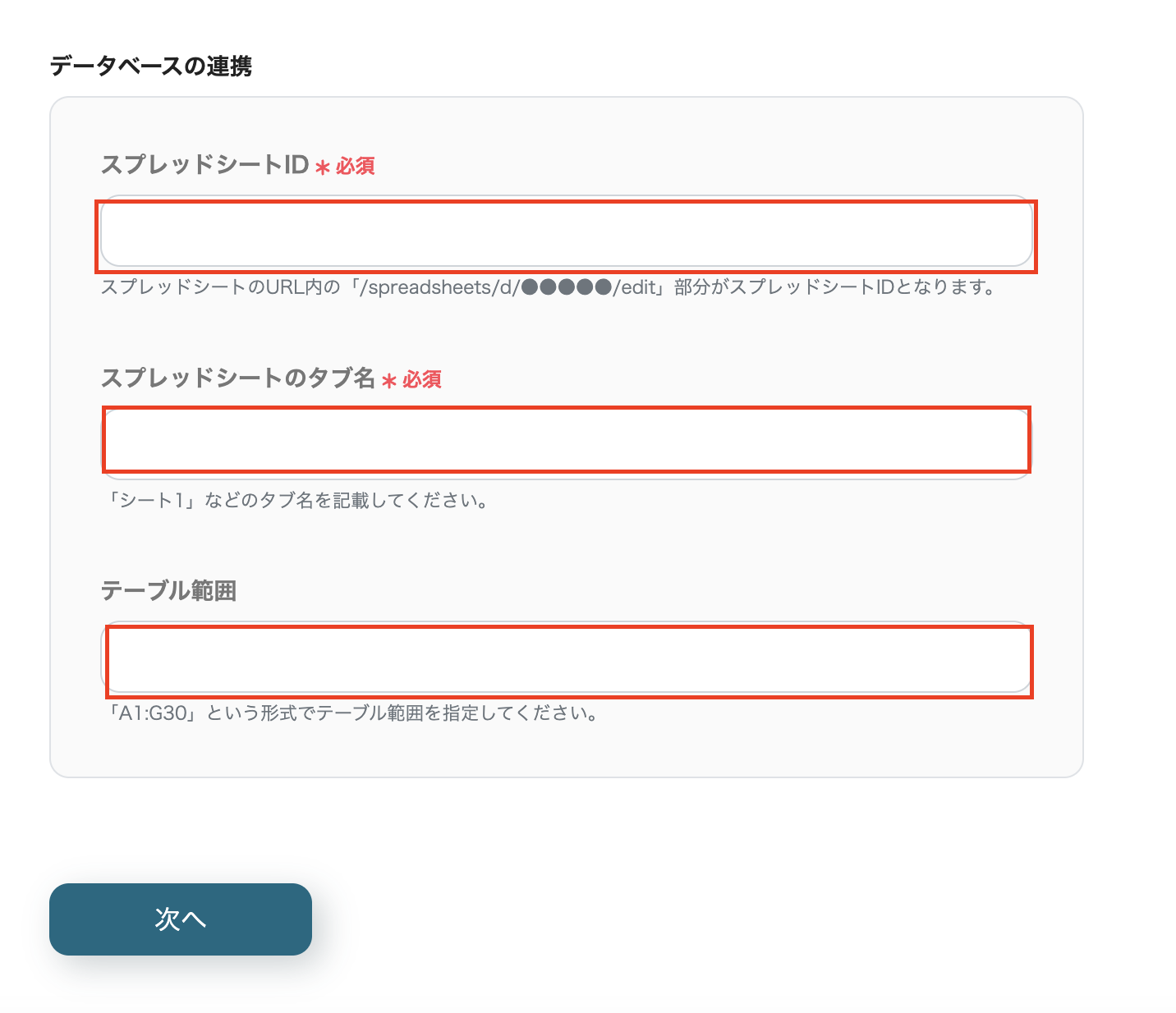 スプレッドシートID、スプレッドシートのタブ名、テーブル範囲を設定し、「次へ」をクリックしましょう。