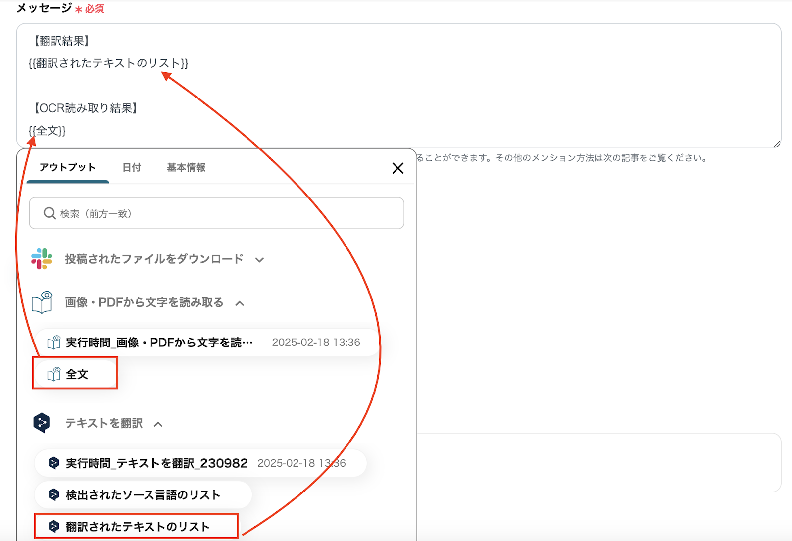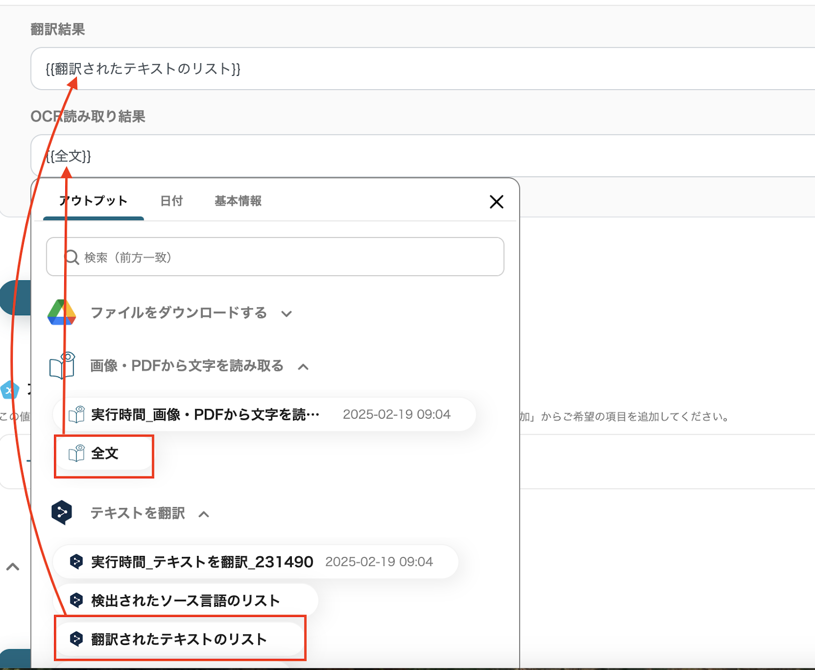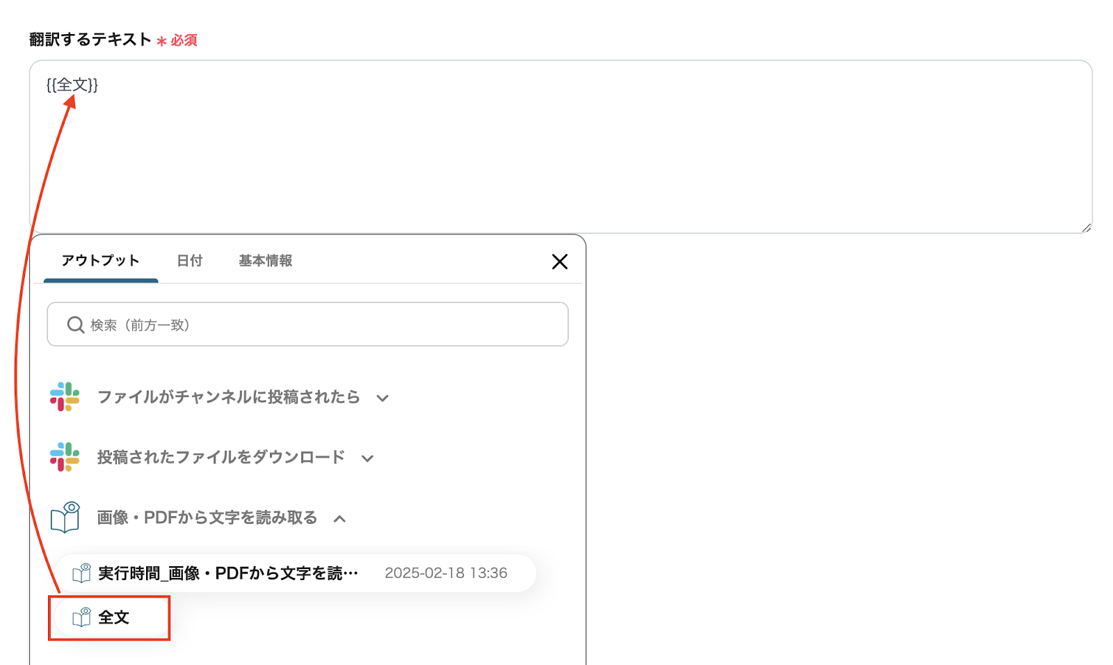 翻訳するテキストは「画像・PDFを読み取る」で取得した「全文」をアウトプットから選択しましょう。