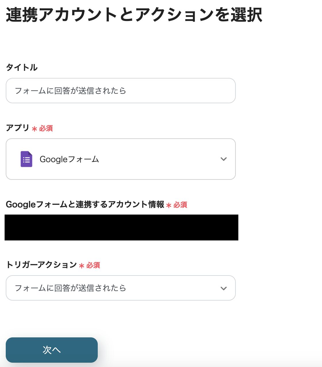連携アカウントとアクションを選択の画面は、タイトルや連携アカウント、トリガーアクションを確認して「次へ」をクリックしましょう。