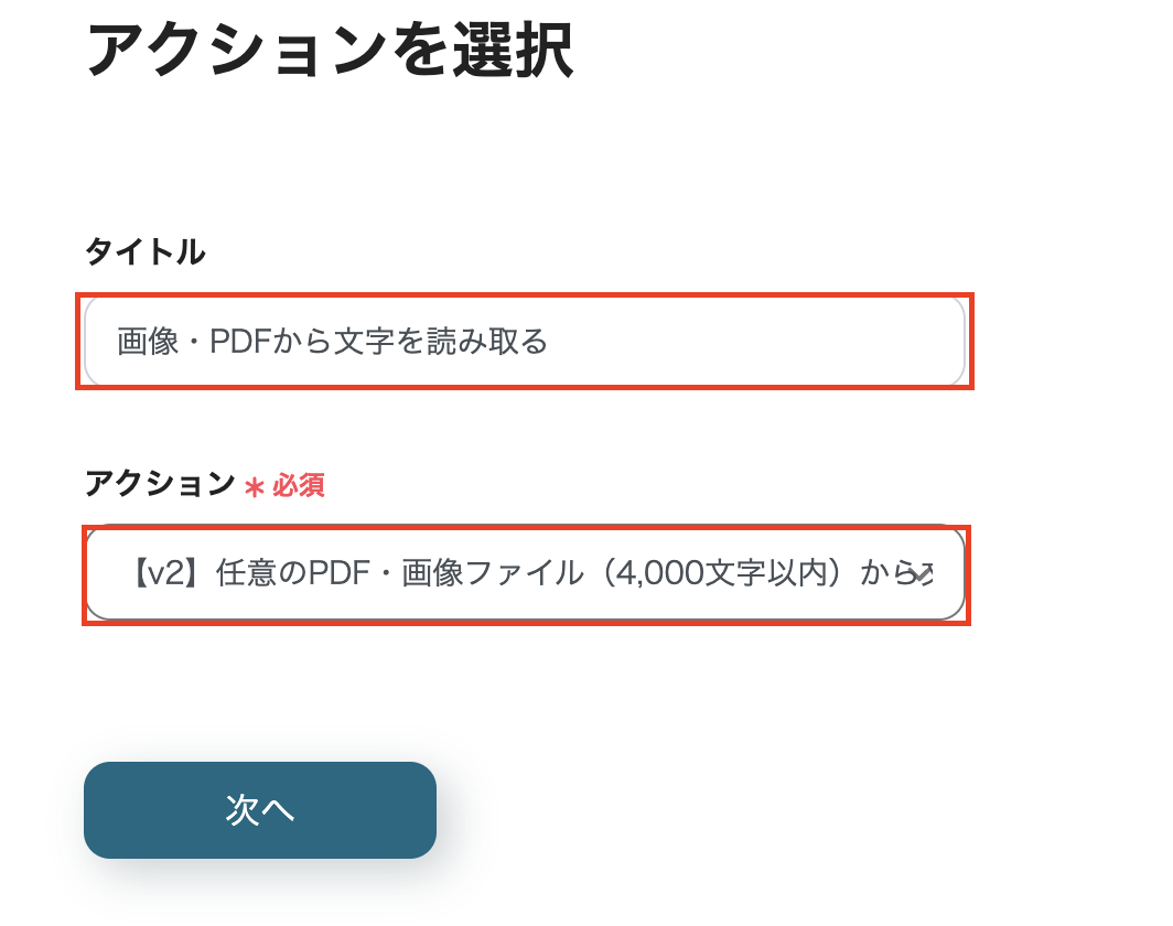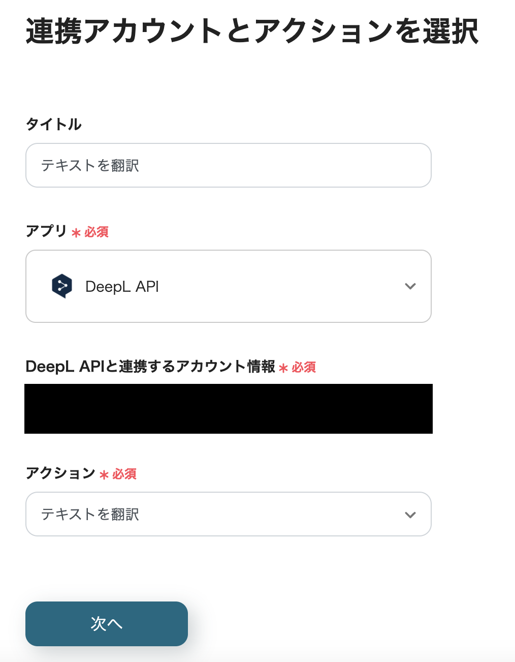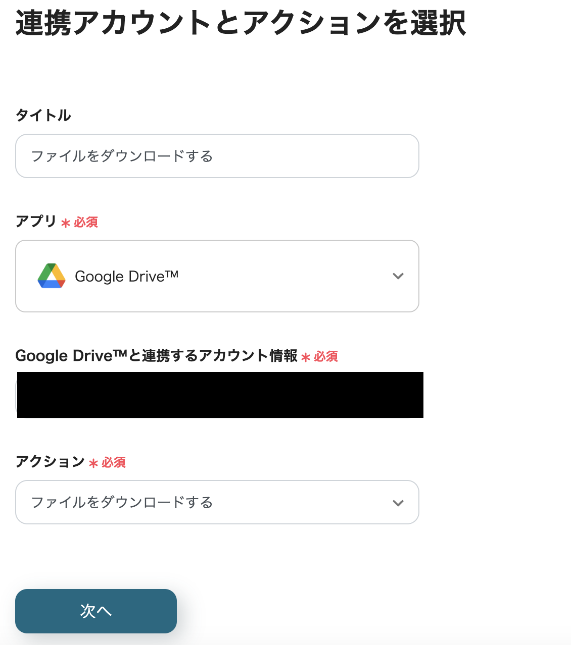 連携アカウントとアクションを選択は、連携するアカウントとアクションを確認して「次へ」をクリックします。
