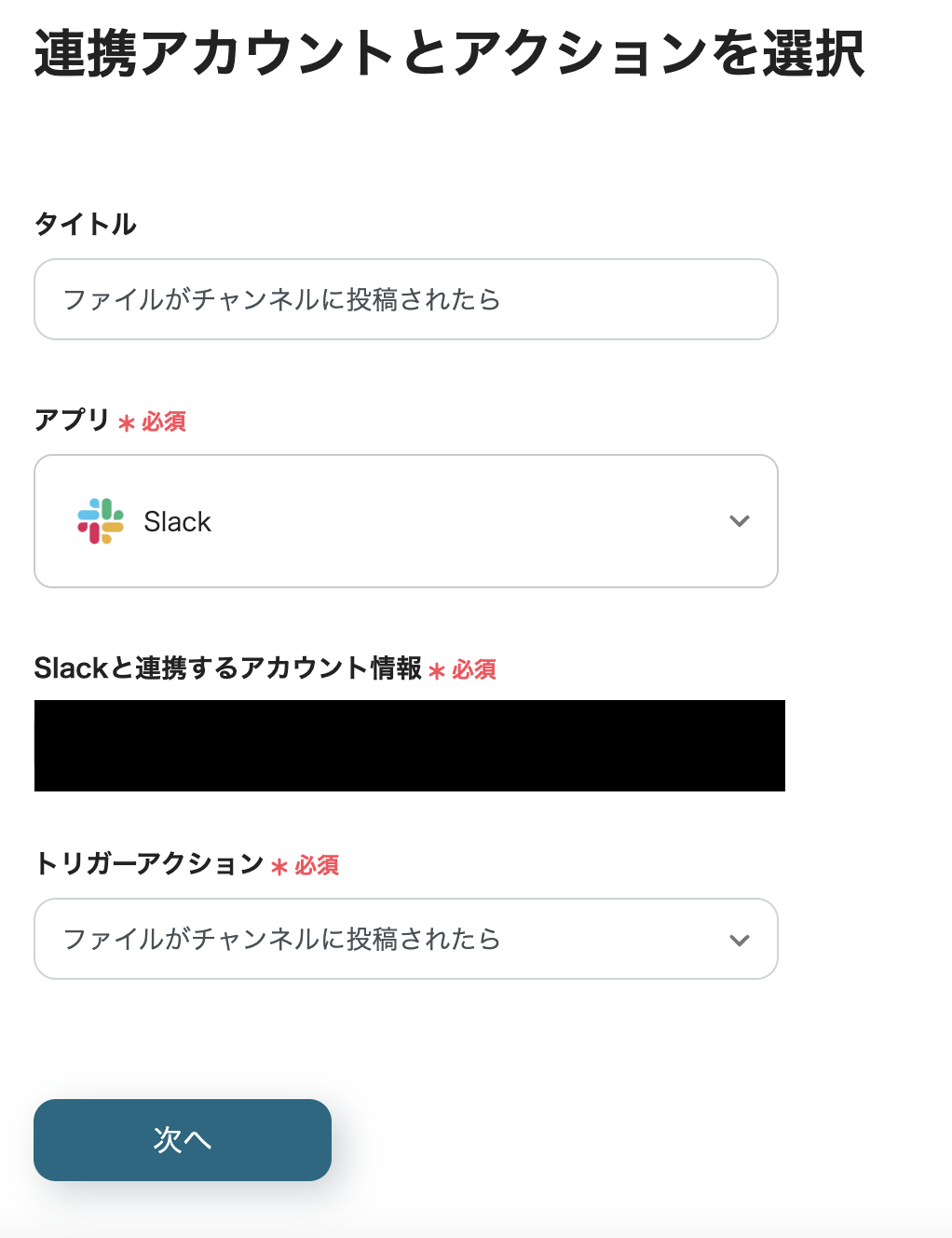 トリガーアクションは「ファイルがチャンネルに投稿されたら」を選択しましょう。