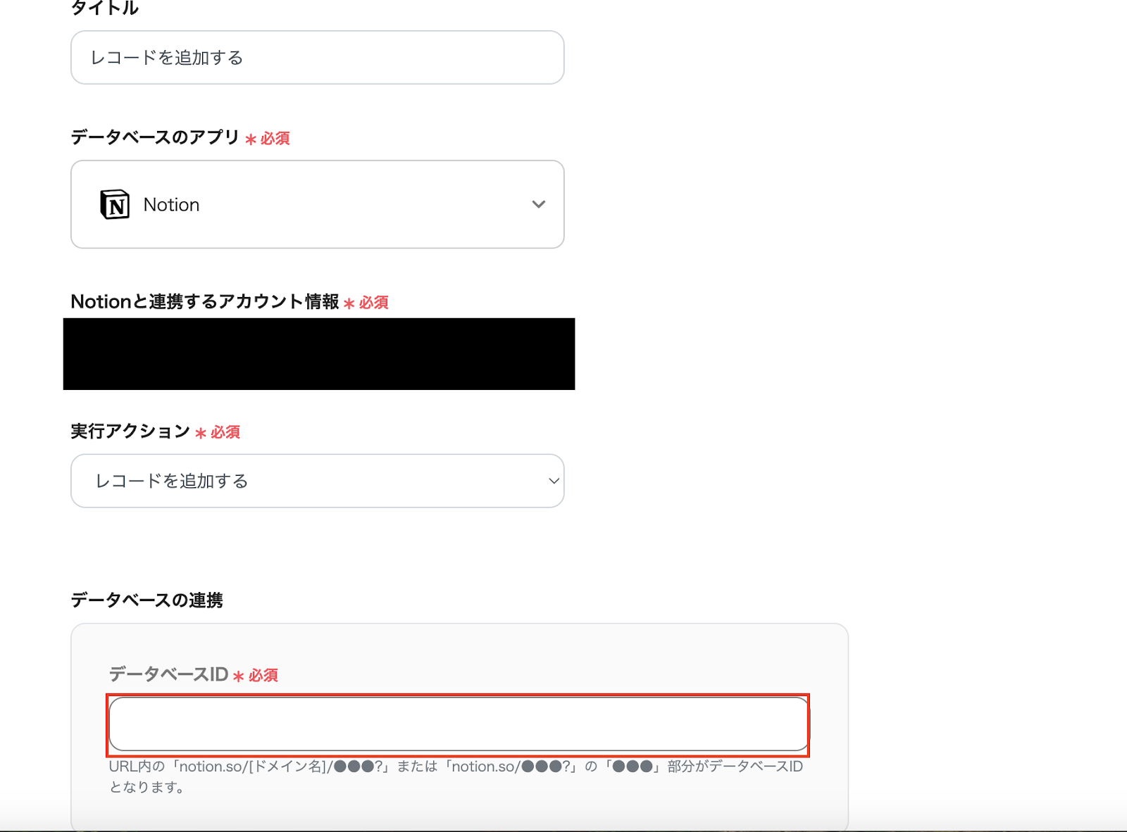 データベースの連携は、連携するアカウントやアクションを確認します。