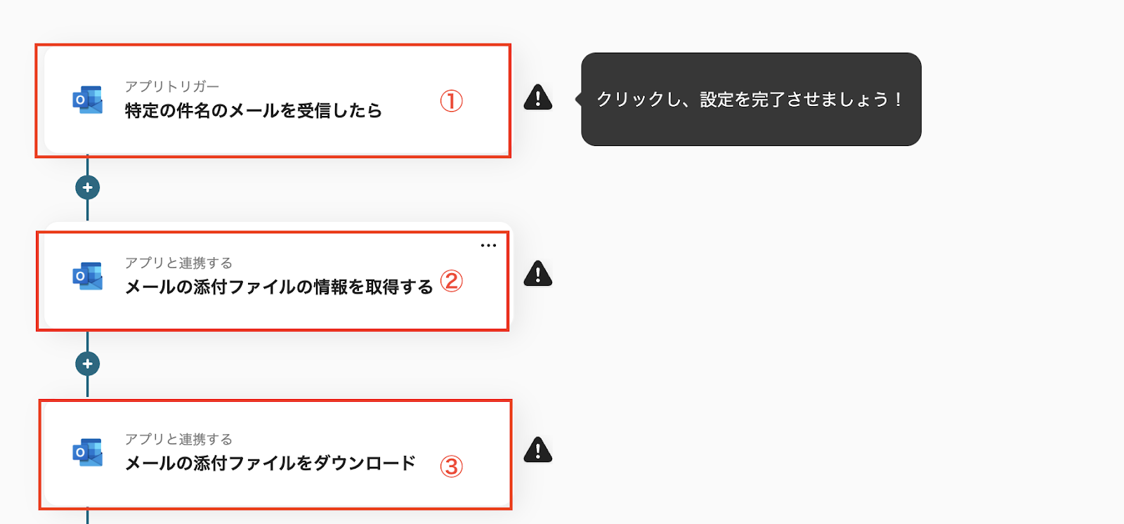 まずはOutlookの設定を①から順番に行いますので、「特定の件名のメールを受信したら」をクリックしましょう。①特定の件名のメールを受信したら