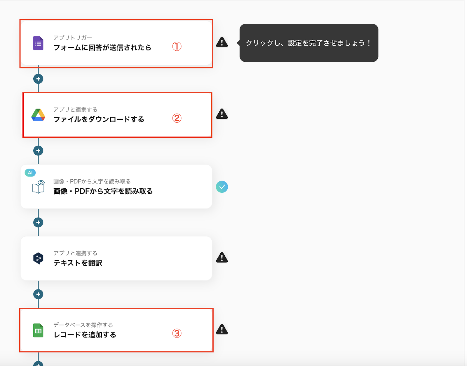 ここからは「Googleフォームで回答されたら、OCRで読み取り、DeepLで翻訳してGoogle スプレッドシートに追加する」フローボットを設定しましょう。