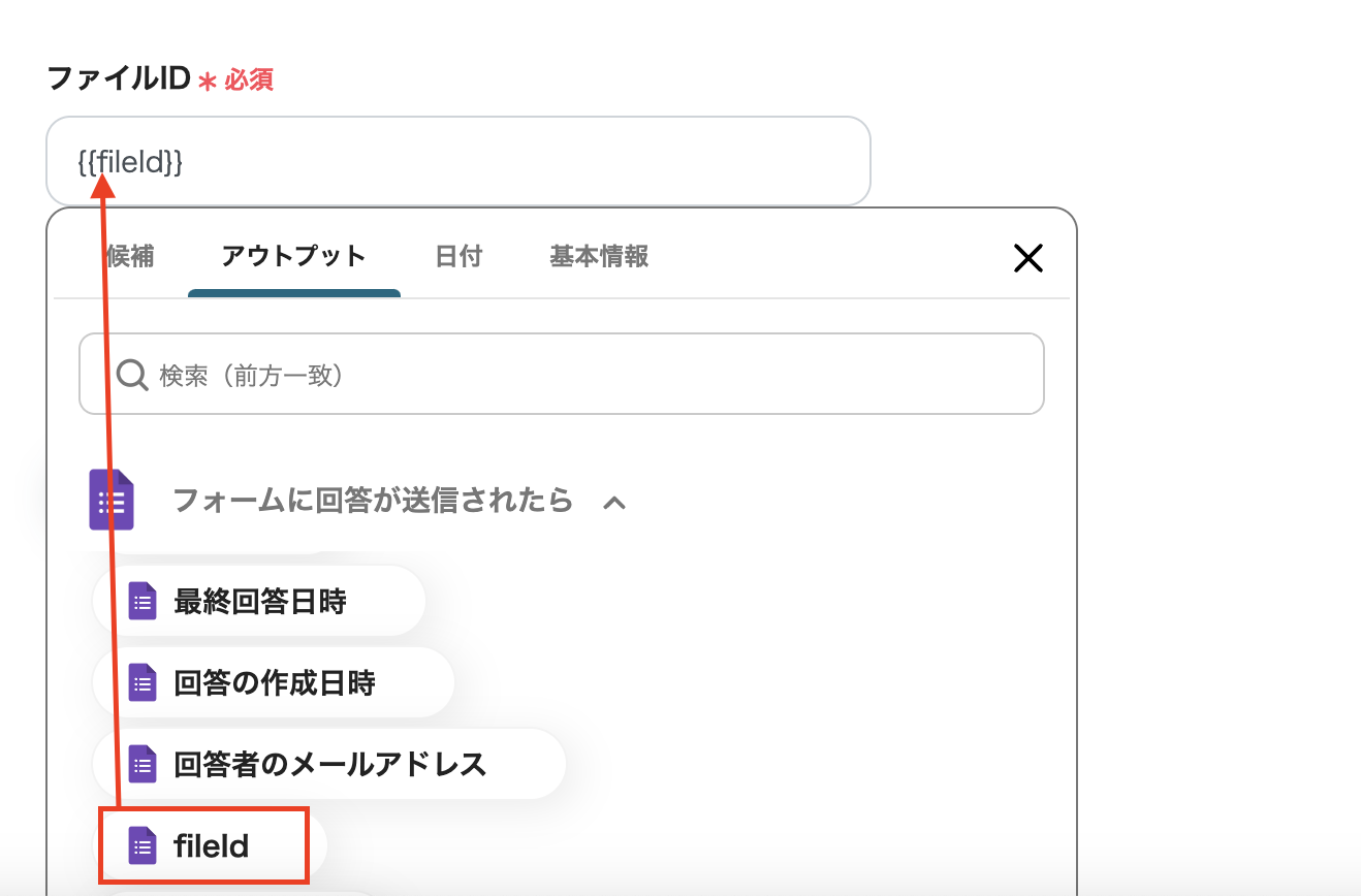 ファイルIDはGoogleフォームのアウトプットから「filed」を選択しましょう。