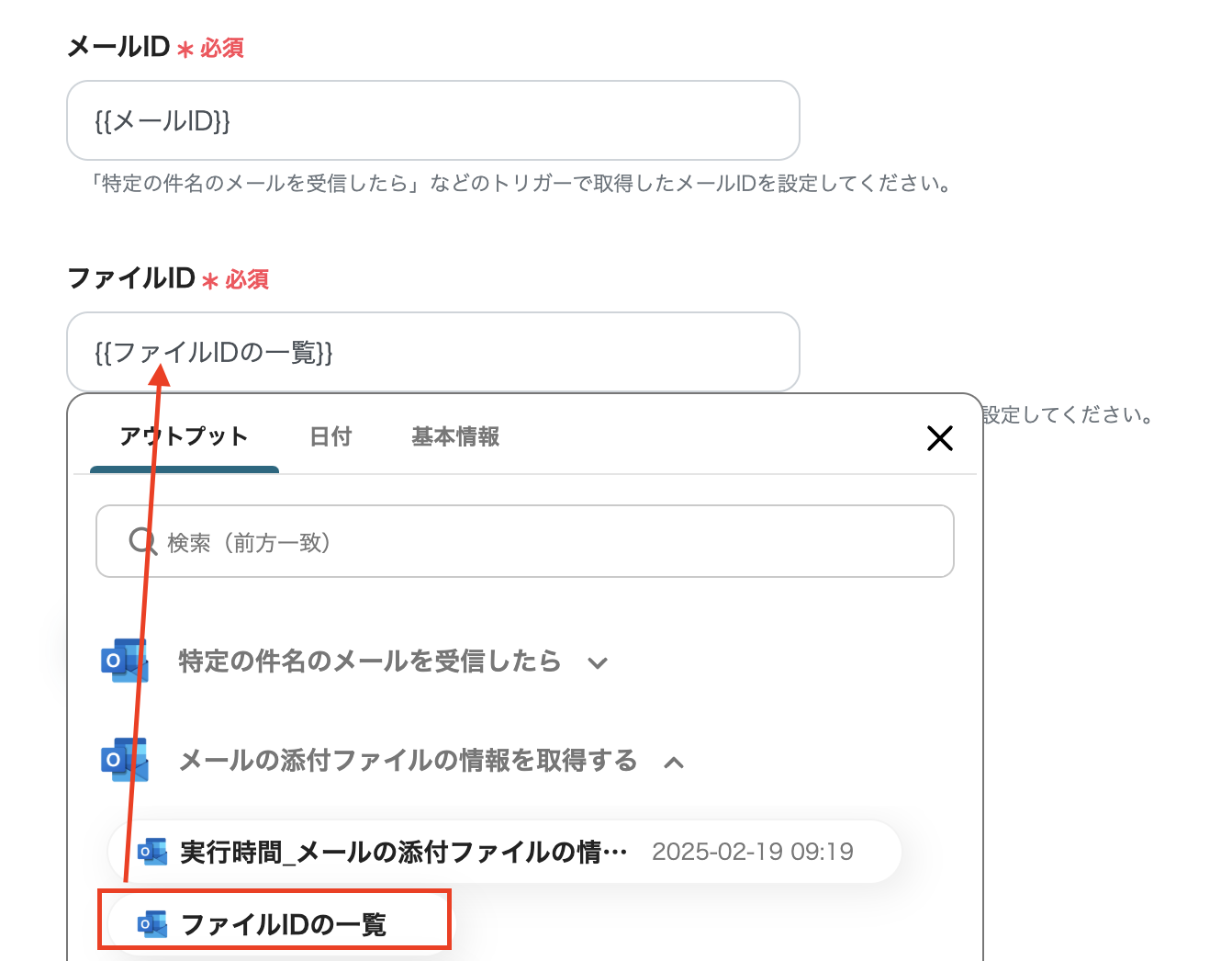 ファイルの添付方法は、「取得した値を使用」と「取得したファイル」を選択しましょう。