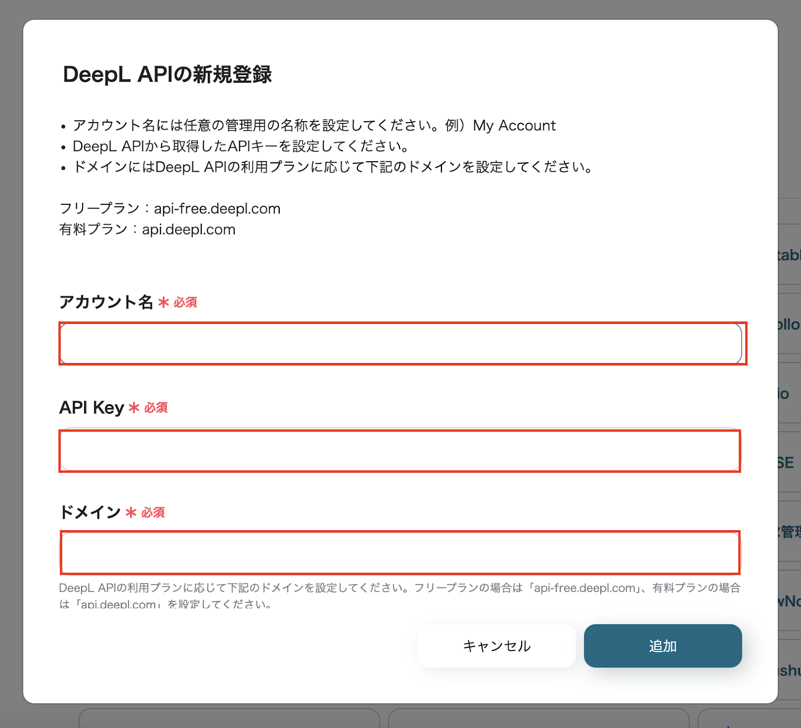 マイアプリ→新規接続の順でクリックしたら、DeepLを選択しましょう。